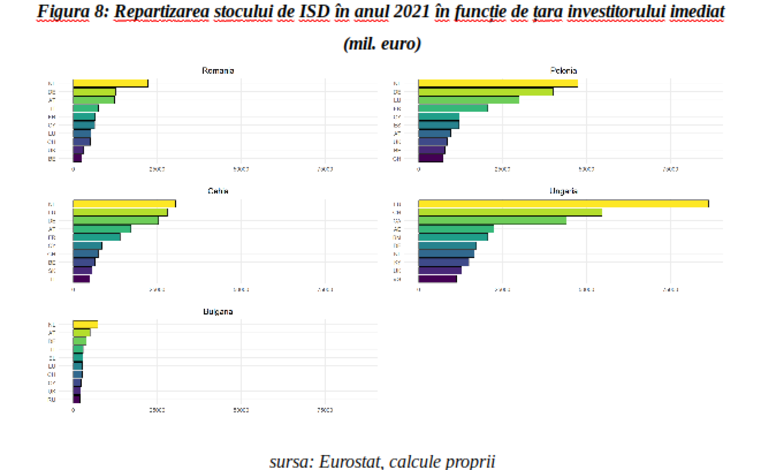 În cazul României, deși fluxurile nete de investițiile străine directe au crescut semnificativ în ultimii ani, iar stocul lor a depășit în anul 2021 pragul de 100 de miliarde de euro, această valoare ne plasează încă la o mare distanță în urma Ungariei, Poloniei, dar și a Cehiei. În termeni relativi, raportat la PIB, stocul de ISD este comparabil cu cel al Poloniei, dar semnificativ mai mic decât în cazul Bulgariei și al Cehiei și cu mult în urma Ungariei. Totodată, se observă că în cazul României și al Poloniei, raportul dintre ISD și PIB s-a menținut stabil pe ansamblul perioadei 2013-2021, în jurul nivelului de 41 la sută, în Cehia acesta a crescut de la circa 61 la sută până la aproximativ 74 la sută, iar în Bulgaria s-a diminuat ușor, de la 87 la sută la 71 la sută. Potrivit Eurostat, în Ungaria, raportul dintre stocul de investiții străine directe și PIB era în anul 2021 de peste 205 la sută.