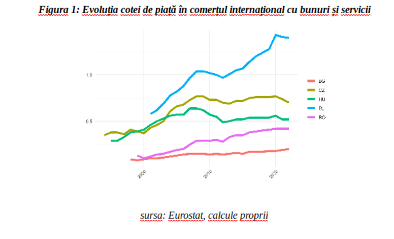 Datele publicate de Eurostat arată că pe parcursul ultimilor 20 de ani cota de piață a exporturilor românești în cadrul comerțului internațional cu bunuri și servicii a crescut semnificativ, dar s-a menținut la unul dintre cele mai reduse niveluri prin comparație cu țările din zonă. Graficul de mai jos arată că Polonia a consemnat cel mai important câștig de cotă de piață în perioada menționată, evoluția sa ascendentă fiind stopată doar în anii de maximă intensitate ai crizei financiare globale și ai crizei datoriilor suverane în Europa, iar ulterior în perioada pandemică. România a înregistrat la rândul său un avans important în termeni relativi, plecând de la o bază mult mai redusă, însă nu a câștigat pe parcursul a mai mult de 20 de ani nici o poziție în clasamentul regional, chiar dacă Ungaria și Cehia au avut practic o evoluție plafonată ulterior anului 2007. Astfel, cota de piață a exporturilor românești s-a distanțat semnificativ de cea a Bulgariei, care a consemnat un progres mult mai lent și s-a apropiat de cea a Ungariei, fără însă să o depășească deocamdată.