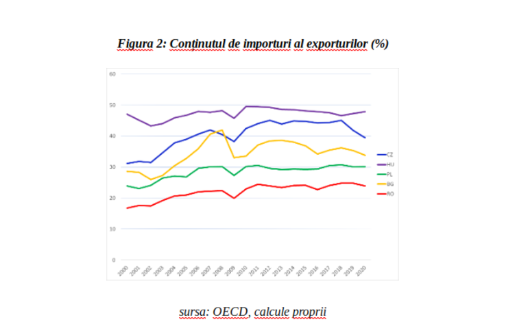 Deși România avea în anul 2020 o pondere mai mare a importurilor folosite în producerea exporturilor comparativ cu media Uniunii Europene (23,9% în România în contrast cu 15,9% media UE), în plan regional ne-am plasat pe parcursul ultimilor 10 ani pe poziții mai favorabile față de țările din vecinătate (de exemplu, în 2020 acest procent era de 30,1% în Polonia, 39,4% în Cehia și 47,9% în Ungaria – vezi Figura 2). Totuși, România nu reușește deocamdată să îmbunătățească fundamental nivelul de valoare adăugată al procesele de producție internă astfel încât să amelioreze dependența exporturilor de importuri în cadrul categoriilor de bunuri cu grad mediu și ridicat de complexitate. Aceste cifre contrazic opinia că exporturile românești se bazează într-o mare proporție pe importuri, opinie care a circulat destul de mult în ultima perioadă. Așadar, conform acestor date, nu se poate confirma ipoteza că o mai mare stimulare a exporturilor ar antrena creșterea de o manieră semnificativă a importurilor. De asemenea, datele amintite subliniază faptul că majoritatea importurilor sunt determinate de cererea internă de consum, dar și de investiții, care depășesc în continuare capacitatea ofertei interne.