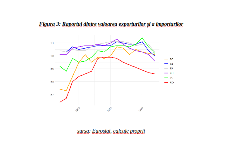 Figura 3 de mai jos arată că anterior anului 2005 România se plasa pe cea mai nefavorabilă poziție în regiune din perspectiva raportului dintre exporturi și importuri, dar a recuperat rapid decalajul major față de economiile vecine, astfel că în anii 2014-2015 deficitul comercial era foarte mic în termeni procentuali. În tot acest răstimp însă, Cehia și Ungaria consemnau excedente comerciale, acestui grup adăugându-i-se și Polonia după anul 2012.