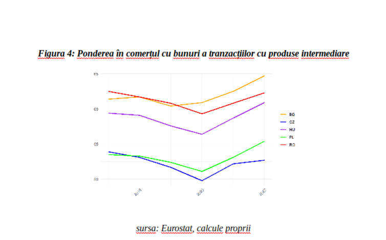 Un factor important pentru evoluția nefavorabilă l-a reprezentat deficitul bugetar semnificativ mai mare consemnat în România față de țările vecine, dar și factorii structurali au continuat să aibă un rol. Această din urmă afirmație este susținută de imaginea de ansamblu oferită de Figura 4 de mai jos, care arată că România a consemnat, pe parcursul întregii perioade 2015-2022, una dintre cele mai mari ponderi a valorii tranzacțiilor cu produse intermediare raportate la cea a comerțului internațional cu bunuri (importuri + exporturi), fiind depășită doar de Bulgaria.