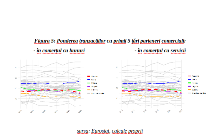Este util să observăm și faptul că diversificarea partenerilor comerciali internaționali ai României s-a menținut pe ansamblul ultimilor 10 ani la un nivel comparabil cu cel al celorlalte țări membre ale Uniunii Europene, inclusiv din vecinătate. Figura 5 de mai jos arată că ponderea tranzacțiilor cu primele 5 țări partenere în comerțul exterior este marginal mai redusă decât în cazul Cehiei sau al Poloniei, precum și al majorității celorlalte state membre. Ponderea covârșitoare a tranzacțiilor cu parteneri din state membre ale pieței unice este firească, iar în aceste limite, dependența față de un număr redus de țări partenere nu este mai mare decât în alte economii din zonă.