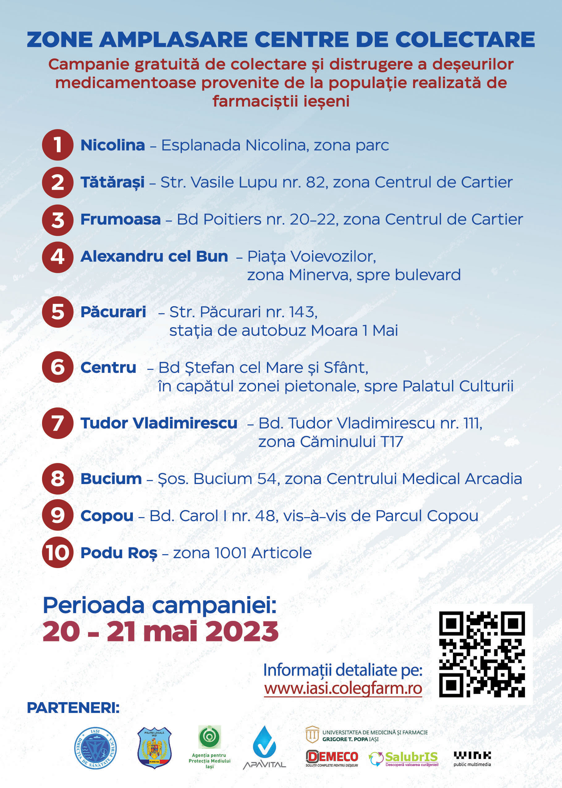 În perioada 20 – 21 mai 2023, între orele 10:00 și 17:00, Colegiul Farmaciștilor din România – Filiala Iași, cu sprijinul Primăriei Municipiului Iași și al altor parteneri instituționali, organizează a doua ediție a unei campanii de colectare corespunzătoare a medicamentelor rămase neutilizate și/sau expirate provenite de la populație. Sub genericul „Medicamentele expirate sunt deșeuri periculoase. Fii responsabil, colectează corespunzător!”, farmaciștii ieșeni își propun să informeze și să educe populația în ceea ce privește păstrarea unui mediu curat și sănătos, să contribuie la protejarea sănătății și siguranței publice, precum și la minimizarea generării de deșeuri. Farmaciștii ieșeni vor asigura colectarea conformă și în siguranță a medicamentelor expirate și/sau neutilizate aduse de cetățeni, eliminând riscul ca o astfel de activitate să dăuneze mediului sau sănătății.