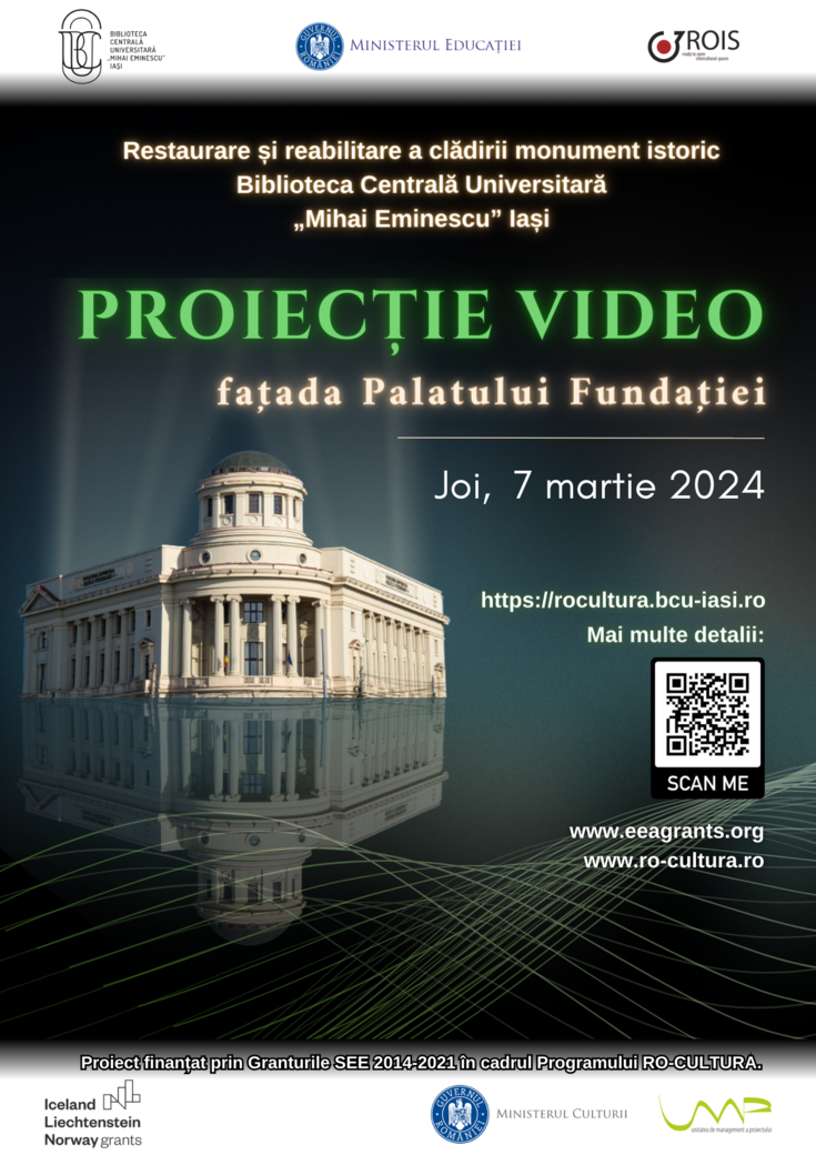 Biblioteca Centrală Universitară „Mihai Eminescu” din Iași vă invită la prima proiecție video pe fațada Palatului Fundației Universitare „Regele Ferdinand I”. Evenimentul va avea loc joi, 07 martie 2024, începând cu orele 19:30. Proiecția în aer liber va putea fi urmărită de cei interesați din parcul situat la poalele Copoului, din vecinătatea Grupului Statuar al Voievozilor, amplasat lângă Casa de Cultură a Studenților. Spectacolul de lumini și de sunet va pune în valoare frumusețea emblematicului edificiu care găzduiește astăzi sediul Bibliotecii Centrale Universitare „Mihai Eminescu” din Iași.