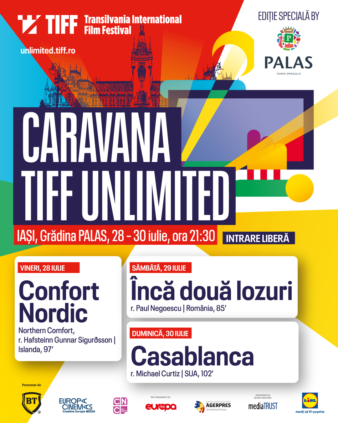 Cele mai apreciate filme din cadrul Transilvania International Film Festival (TIFF) se văd în acest weekend și la Iași. Caravana TIFF Unlimited ajunge în parcul Palas și îi invită pe ieșeni la trei seri de film în aer liber. O peliculă internațională, o producție românească, dar și o poveste de dragoste clasică vor rula pe ecranul uriaș. Intrarea este liberă, în limita locurilor disponibile.