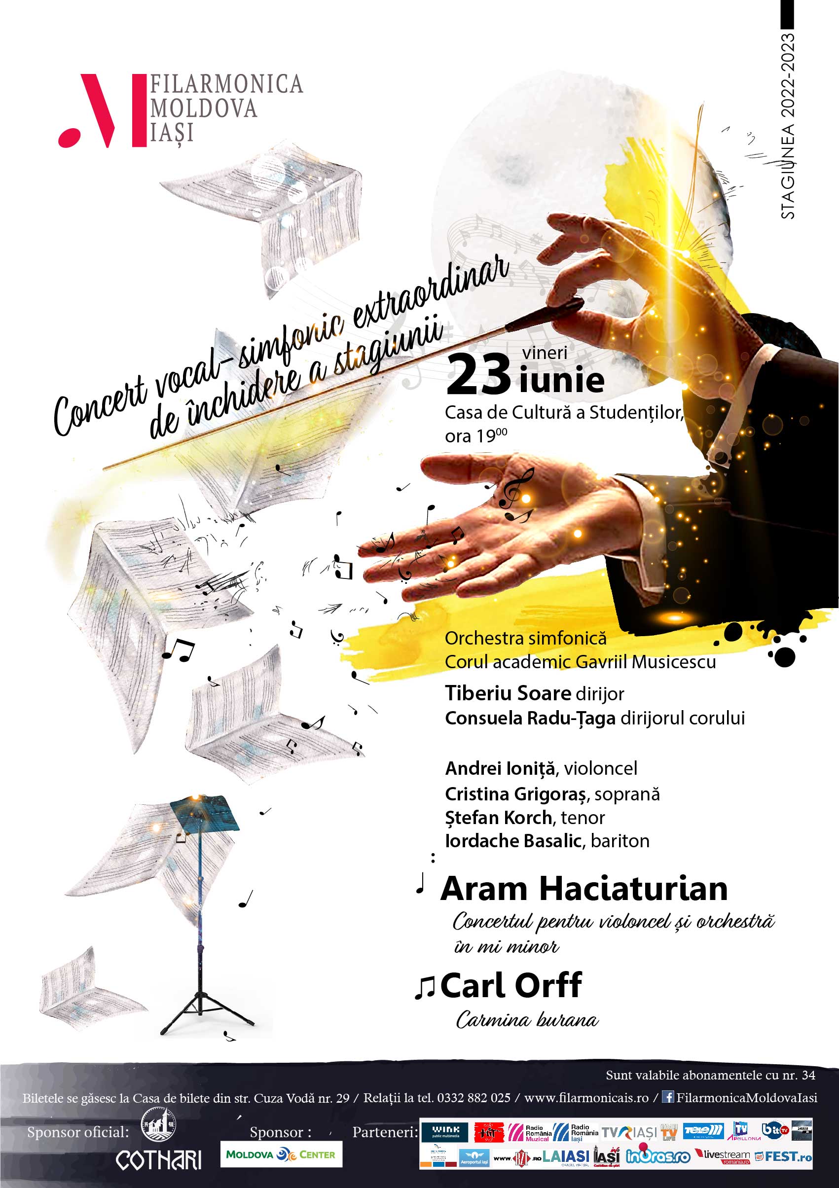 Vineri, 23 iunie 2023, Orchestra simfonică și Corul Academic „Gavriil Musicescu”, cele două ansambluri ale Filarmonicii “Moldova” din Iași, vă invită la Concertul vocal-simfonic extraordinar de închidere a Stagiunii 2022-2023.