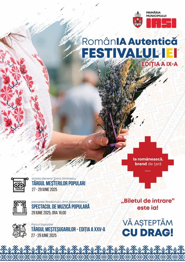 Iașul se pregătește de o sărbătoare a portului popular și a tradițiilor românești! În perioada 27 – 29 iunie 2025, Primăria Municipiului Iași organizează în zona Parcului Expoziției cea de-a IX-a ediție a Festivalului Iei – RomânIA Autentică, un eveniment emblematic ce reunește iubitori ai tradiției, artizani și artiști populari din toate colțurile țării.