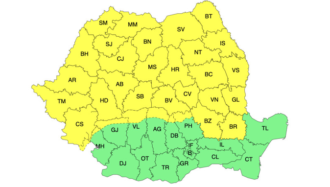 Administrația Națională de Meteorologie a emis vineri o avertizare de Cod Galben pentru majoritatea țării valabilă între 5 aprilie, ora 15:00 și 6 aprilie, ora 03:00.