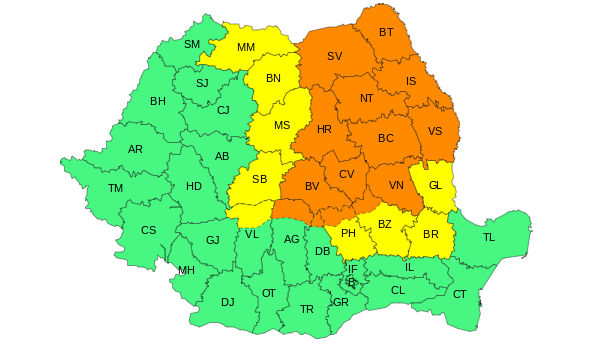 Meteorologii au emis un COD PORTOCALIU de ploi valabil in intervalul pentru judetele din Moldova, Maramureș, cea mai mare parte a Transilvaniei, Munteniei și Dobrogei, unde se vor înregistra precipitații, cu acumulări locale de 20-30 l/mp și pe arii restrânse chiar peste 40 și 60 l/mp.