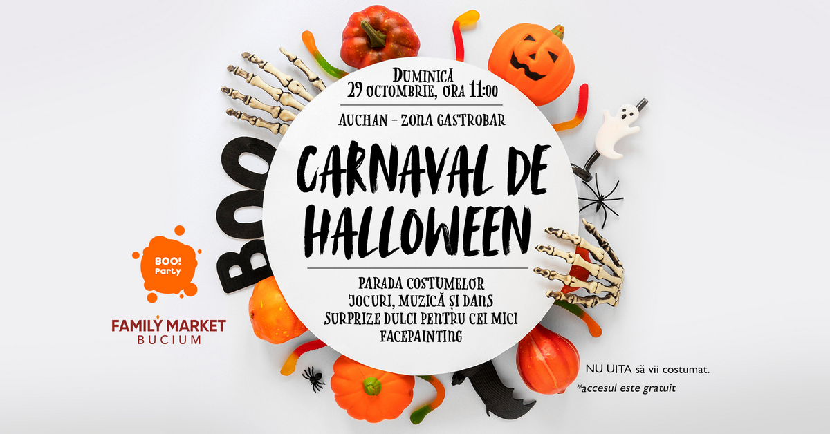 Premii dulci, , jocuri tematice, costume,– pe toate acestea le vei găsi la Family Market Bucium, locul unde cei mici vor intra, pe data de 29 octombrie 2023, în spiritul Halloween-ului. Începând cu ora 11:00, în zona Gastrobar de la Auchan, BOO! Party invită copiii la petrecerea de Halloween, iar mascotele simpatice îi așteaptă să se alăture paradei de costume.