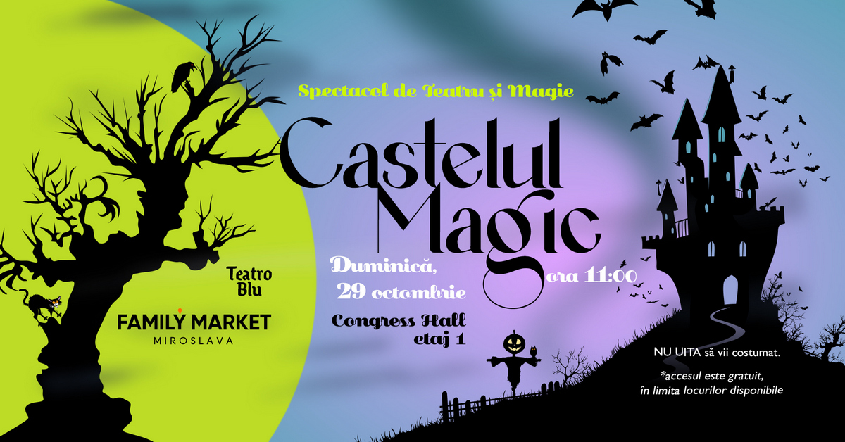 Și la Family Market Miroslava, copiii vor putea să dea frâu liber imaginației odată cu deschiderea unui portal magic care le dezvăluie lumea minunată a misterelor din Castelul Magic. Duminică, începând cu ora 11:00, Teatro Blu îi întâmpină pe micuți, în sala Congress Hall, cu o piesă în care atmosfera stranie, acțiunea plasată într-un castel al magiei și spectacolul de efecte speciale compun cadrul destinat sărbătorii de Halloween. Un șoricel nimerește în acest loc magic, iar copiii vor afla cum reacționează magicianul, locuitorul castelului. Povestea este condimentată cu trucuri de magie originale, fum și efecte de lumină spectaculoase.