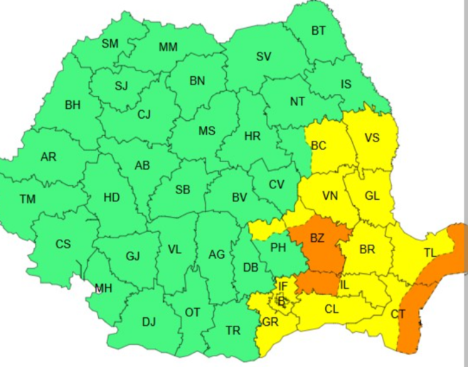 Conform meteorologilor, o avertizare de Cod portocaliu pentru intensificări puternice ale vântului, cu viteze de 70 – 90 km/h, va fi în vigoare pe 26 decembrie, între ora 10:00 și ora 20:00, în zona joasă a județului Buzău și în jumătatea vestică a județului Ialomița, precum și pe litoral.