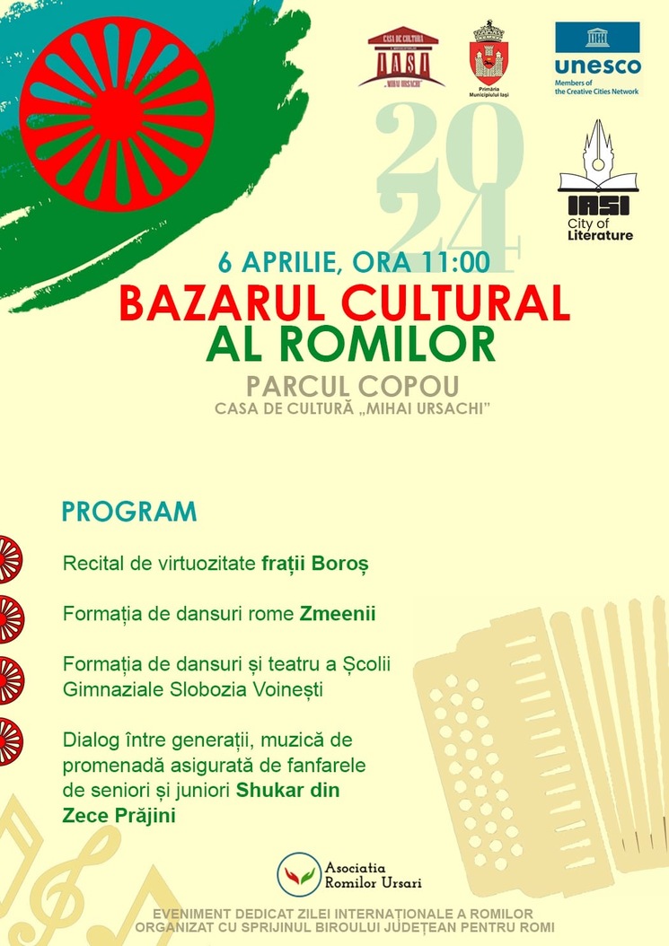 Casa de Cultură „Mihai Ursachi” a Municipiului Iaşi, în parteneriat cu Asociaţia Romilor Ursari, cu sprijinul Biroului Judeţean pentru Romi din cadrul Prefecturii Iaşi organizează evenimentul „Bazarul Cultural al Romilor”. Manifestarea culturală va avea loc sâmbătă 6 aprilie, începând cu ora 11:00, cu prilejul Zilei Internaţionale a romilor, care din 1971, se sărbătoreşte la începutul lunii aprilie în statele din Europa de Est.