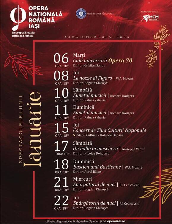 Biletele pentru spectacolele lunii ianuarie sunt disponibile online începând de marți, 16 decembrie, ora 12:00, prin canalele oficiale ale Operei Naționale Române Iași.