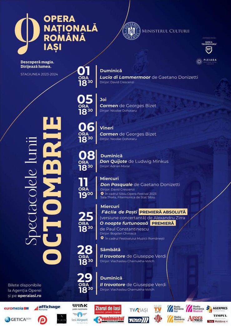 Opera Națională Română din Iași a stabilit programul reprezentațiilor lunii octombrie. Sala Mare a teatrului liric ieșean va găzdui luna viitoare următoarele șapte evenimente: