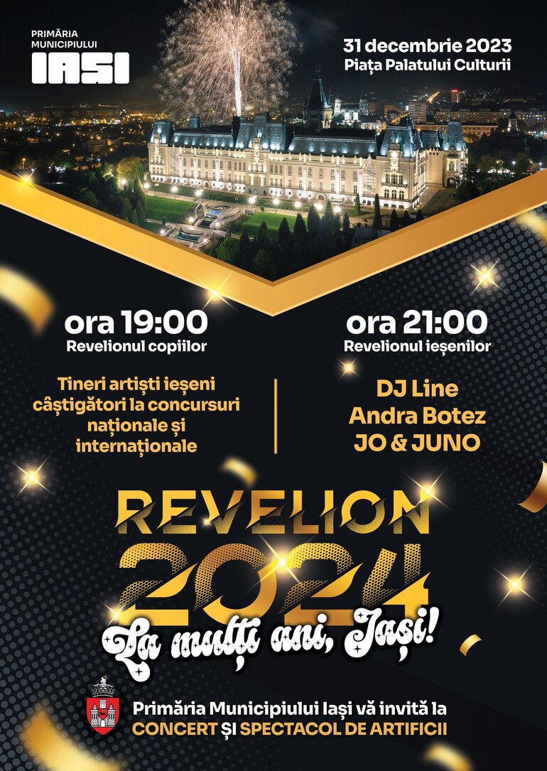 Primăria Municipiului Iași va organiza în noaptea dintre ani „Revelionul ieșenilor”. Spectacolul va avea loc în Piața Palatului Culturii în seara zilei de duminică, 31 decembrie 2023.
