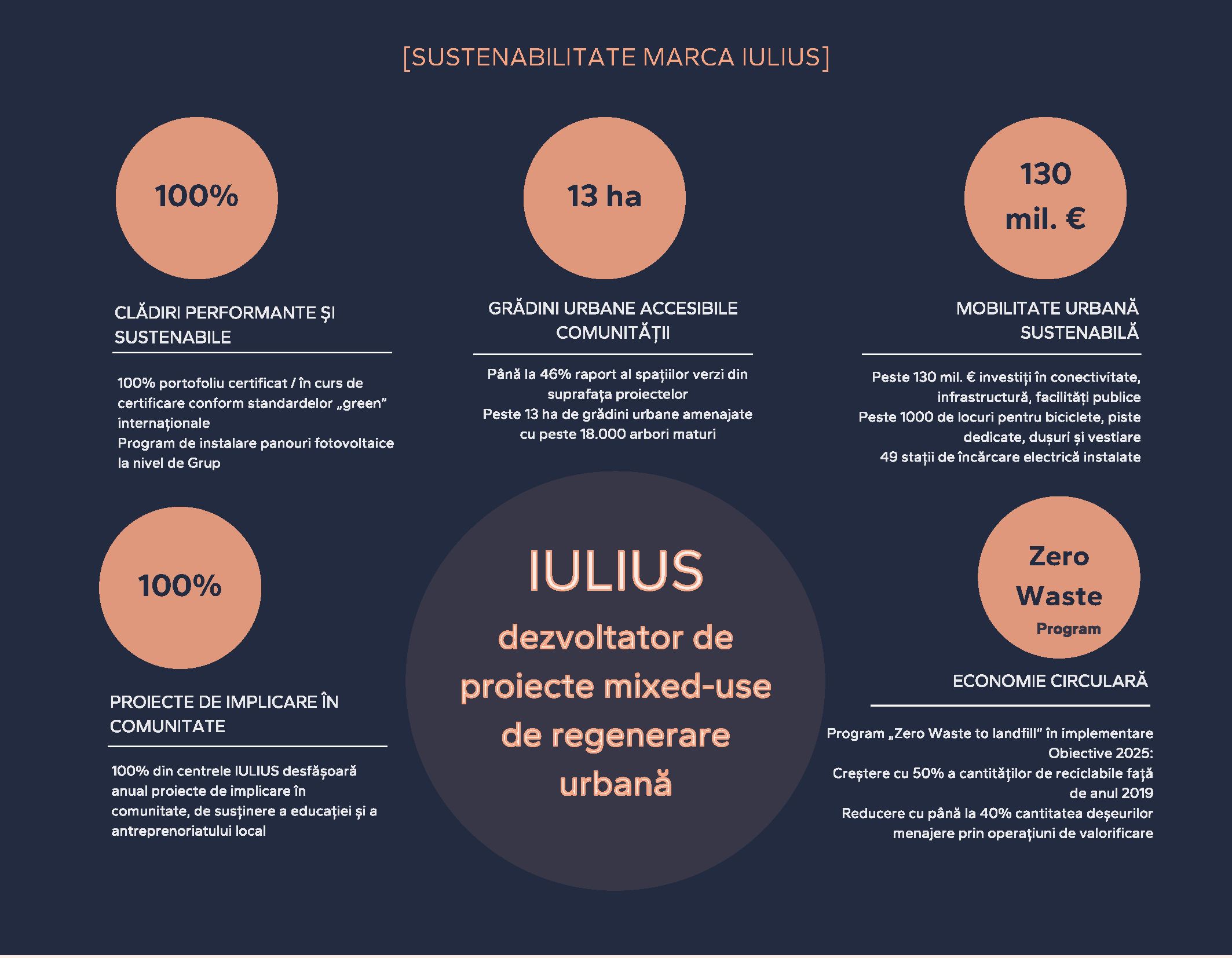 IULIUS își concentrează resursele asupra dezvoltării de proiecte prin care să contribuie la modernizarea orașelor, grija pentru mediu și construirea unor comunități puternice fiind prioritare. Cu 1,2 miliarde de euro investiți în proiectele de regenerare urbană Palas și Palas Campus la Iași și Iulius Town la Timișoara, rețeaua naţională Iulius Mall (Iași, Suceava, Cluj), precum și în două centre de retail de proximitate Family Market în Iaşi, IULIUS a generat valoare şi a stimulat dezvoltarea locală, atrăgând noi investiții prin infrastructura de business creată. „Integrăm continuu cele mai noi soluții în domeniul sustenabilității. Toate clădirile au certificări verzi, folosim materiale cu emisii reduse de carbon, reducem consumul de energie prin panouri fotovoltaice, derulăm proiecte care sprijină educația și antreprenoriatul. Nu în ultimul rând, iubim natura și o aducem în centrul proiectelor noastre, astfel încât lumea să aibă acces rapid la ea. Viitorul va fi și mai verde, pentru că și în proiectele mixed-use pe care le propunem, la Cluj și Constanța, natura va fi elementul central”, a spus Dan Adrian Chelaru, Group Sustainability Officer IULIUS.