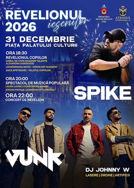 Primăria Municipiului Iași și Ateneul Național din Iași au pregătit o seară de Revelion care începe cu râsete de copii și se termină sub cerul luminat de artificii, cu muzică live, lasere și drone.