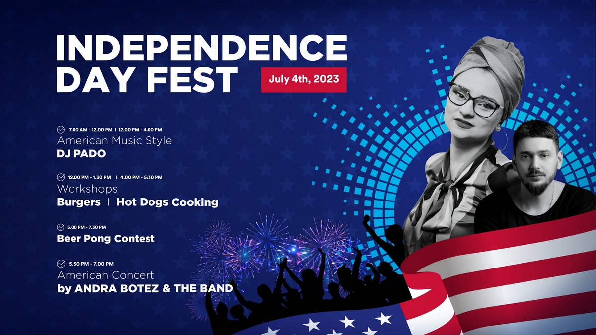 Petrecerea continuă în Piațeta Palas Campus, unde, de la ora 17.30, va avea loc un concert tematic susținut de Andra Botez & The Band. Aici sunt așteptați toți ieșenii care vor să experimenteze atmosfera zilei de 4 iulie, în stil american.