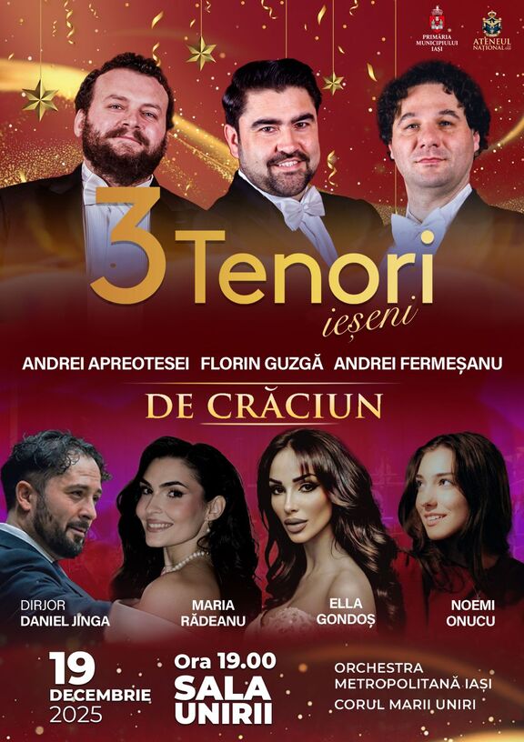 La Iași, finalul de an aduce pe scenă o serie de concerte de Sărbători susținute de cei trei Tenori ieșeni – Andrei Apreotesei, Florin Guzgă și Andrei Fermeșanu.