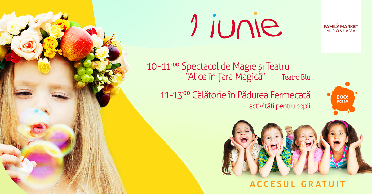 Ca de fiecare dată, Family Market Miroslava și Family Market Bucium îi așteaptă pe cei mici cu muzică, dans, jocuri, concursuri și modelaj de baloane. Descoperă miracolul copilăriei împreună cu micuțul tău prin intermediul activităților puse la dispoziție de cei de la BOO Party! De la ora 11:00, copiii pleacă într-o Călătorie în Pădurea Fermecată, plină de surprize și aventură, împreună cu personajele preferate din povești și animațiile Disney. Tot ce au nevoie este entuziasmul și un dram de încredere pentru a-și pune imaginația la lucru. Participarea este gratuită, în limita locurilor disponibile. Ziua va continua cu sesiuni de face painting și cu cea mai veselă paradă a animatorilor BOO Party!, care vor împărți baloane copiilor și vor asigura buna dispoziție a prichindeilor.