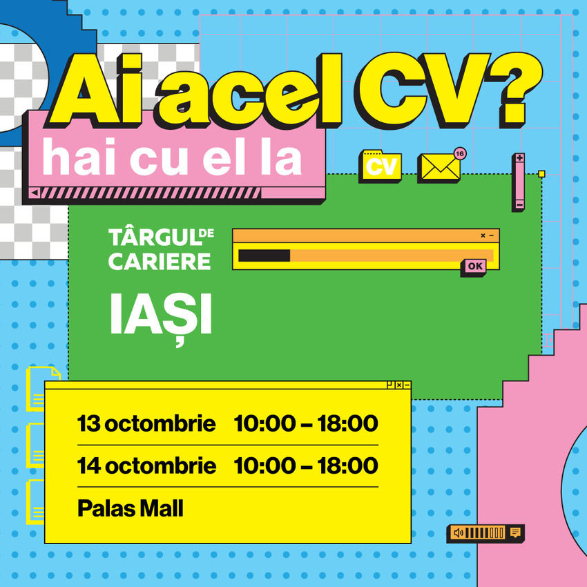 Atriumul Palas găzduiește vineri și sâmbătă, 13 – 14 octombrie 2023, Târgul de Cariere, unde 40 de companii își vor prezenta oferta de muncă celor peste 7.000 de candidați așteptați să vină la eveniment. Ofertele de job sunt variate, în domenii precum: inginerie, producție, automotive, retail & FMCG, logistică & transport, IT, comerț, marketing, comunicare, servicii & BPO, resurse umane, cercetare, financiar, construcții & imobiliare.