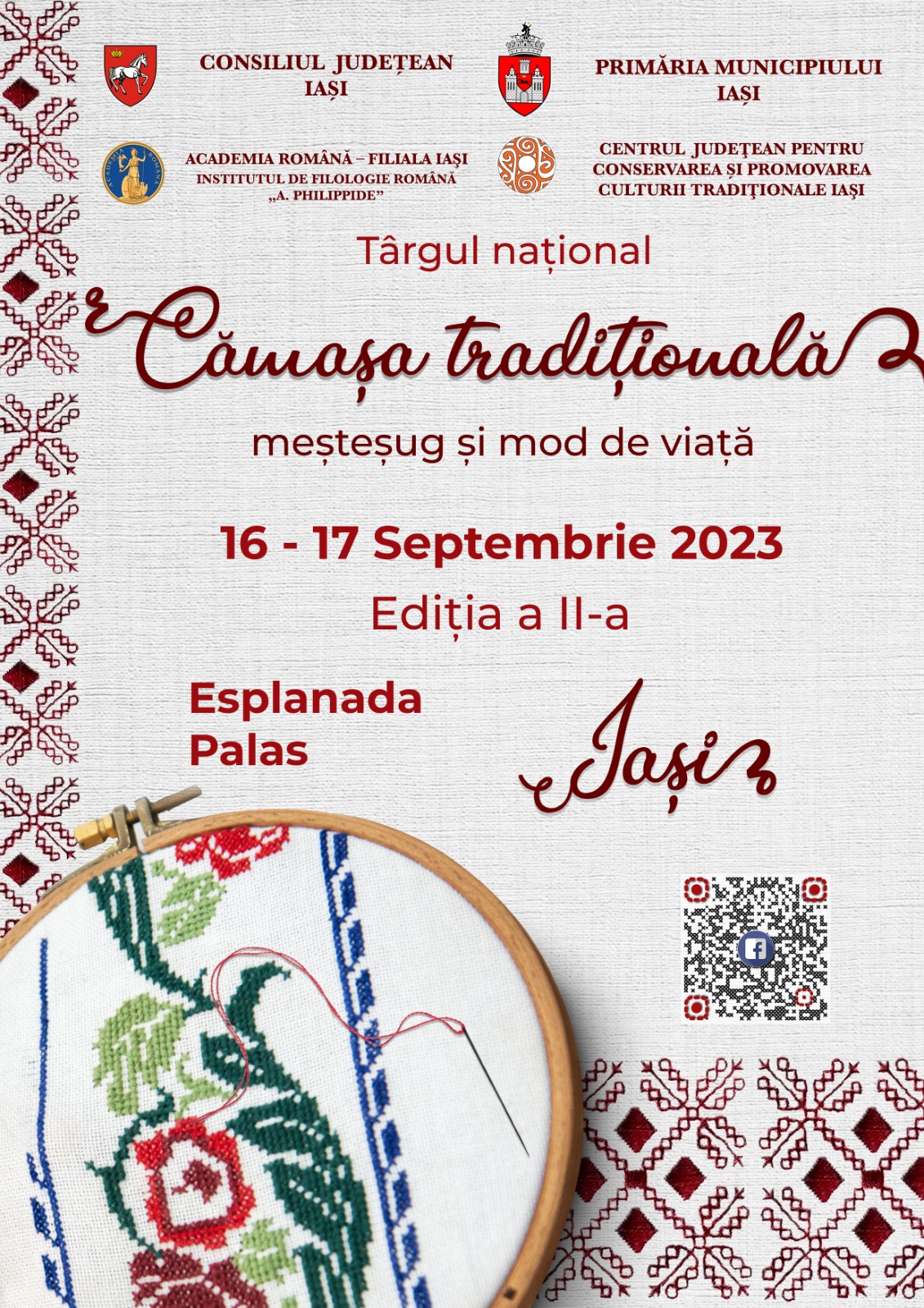 Sâmbătă și duminică, esplanada Palas va găzdui cea de-a II-a ediție a Târgului național „Cămașa tradițională – meșteșug și mod de viață”, eveniment care aduce creațiile tradiționale autentice ale meșterilor populari recunoscuți din județele Cluj, Iași, Botoşani, Brăila, Buzău, Neamț, Suceava, Vaslui, dar și din Republica Moldova. Se vor organiza ateliere de creație interactive, coordonate de meșterii participanți, unde cei interesați de portul popular vor afla mai multe detalii despre cusutul unei cămăși tradiționale românești.