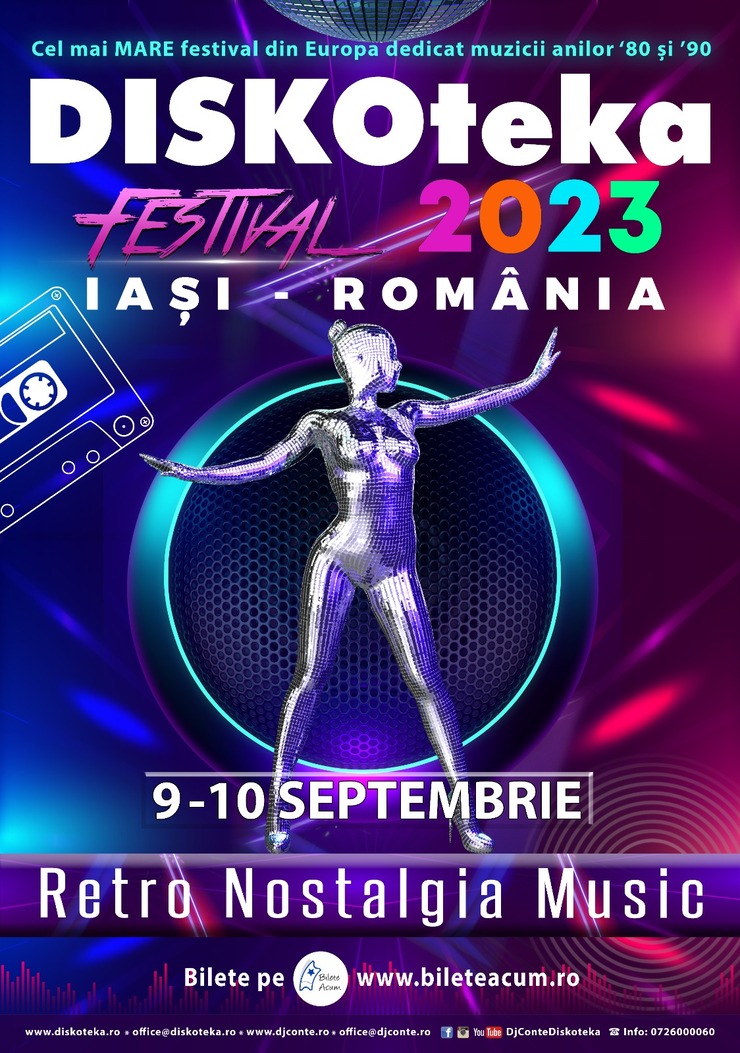 Mai este doar o zi până la DISKOteka Festival, ce va avea loc în parcul Palas și care aduce pe aceeași scenă cei mai în vogă artiști internaționali și naționali din anii ’80-’90. Pe 9 și 10 septembrie, emblematicele vedete ale genurilor pop, dance și eurodance care au bucurat generații vor face „echipă” cu vedete incontestabile ale muzicii românești și vor aduce distracția muzicală „ca pe vremuri”, în Iași. Gazdele celor două seri de spectacol și dans vor fi George Zafiu, una dintre cele mai cunoscute voci ale FM-ului național și showmanul Dan Negru. Mai multe detalii despre eveniment găsești pe www.diskoteka.ro. Biletele pot fi achiziționate din Palas Mall (etaj 1) și de pe bileteacum.ro, iar programul complet este: